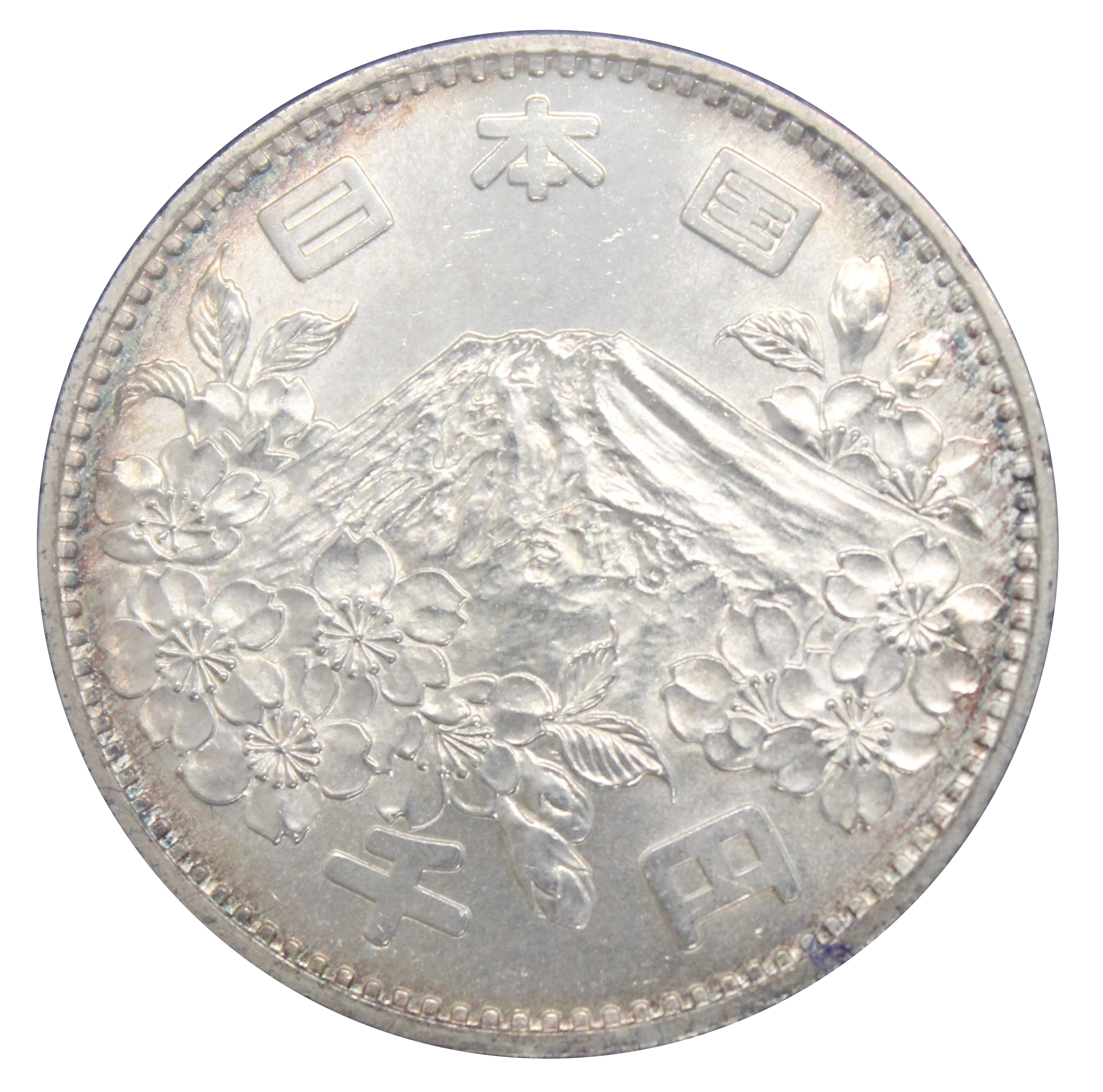 This was the first commemorative coin issued in Japan in 1964. Two types were issued: a 1,000-yen silver coin and a 100-yen silver coin.