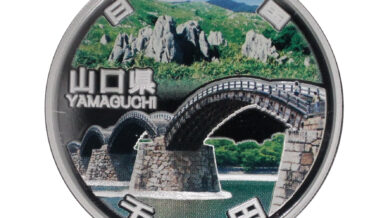 These silver coins were issued to commemorate the enforcement of Japan's Local Autonomy Law.Each of the 47 prefectures has its own unique design.The coins of Yamaguchi Prefecture feature Kintaikyo Bridge and Akiyoshidai.