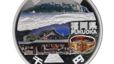 These silver coins were issued to commemorate the enforcement of Japan's Local Autonomy Law.Each of the 47 prefectures has its own unique design.The Fukuoka Prefecture coin depicts Okinoshima, Munakata Taisha Shrine, and the national treasure, the gold ring.