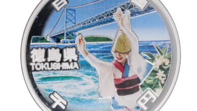 These silver coins were issued to commemorate the enforcement of Japan's Local Autonomy Law.Each of the 47 prefectures has its own unique design.Tokushima Prefecture's coins feature the Naruto whirlpools, the Awa Odori dance, and sudachi blossoms.
