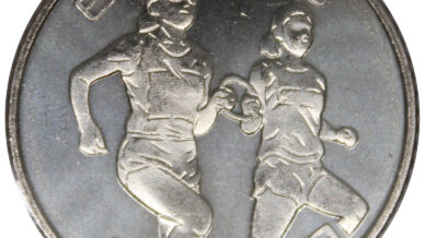 This 100-yen coin was issued to commemorate the Tokyo 2020 Paralympic Games.There are seven types of Paralympic commemorative 100-yen coins in total.This coin depicts Athletics, one of the Paralympic sports.