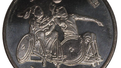 This 100-yen coin was issued to commemorate the Tokyo 2020 Paralympic Games.There are seven types of Paralympic commemorative 100-yen coins in total.This coin depicts Wheelchair Rugby, one of the Paralympic sports.