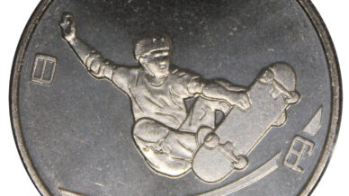 This 100-yen coin was issued to commemorate the Tokyo 2020 Olympic Games.There are Thirteen types of Olympic commemorative 100-yen coins in total.This coin depicts Skateboarding, one of the Olympic sports.