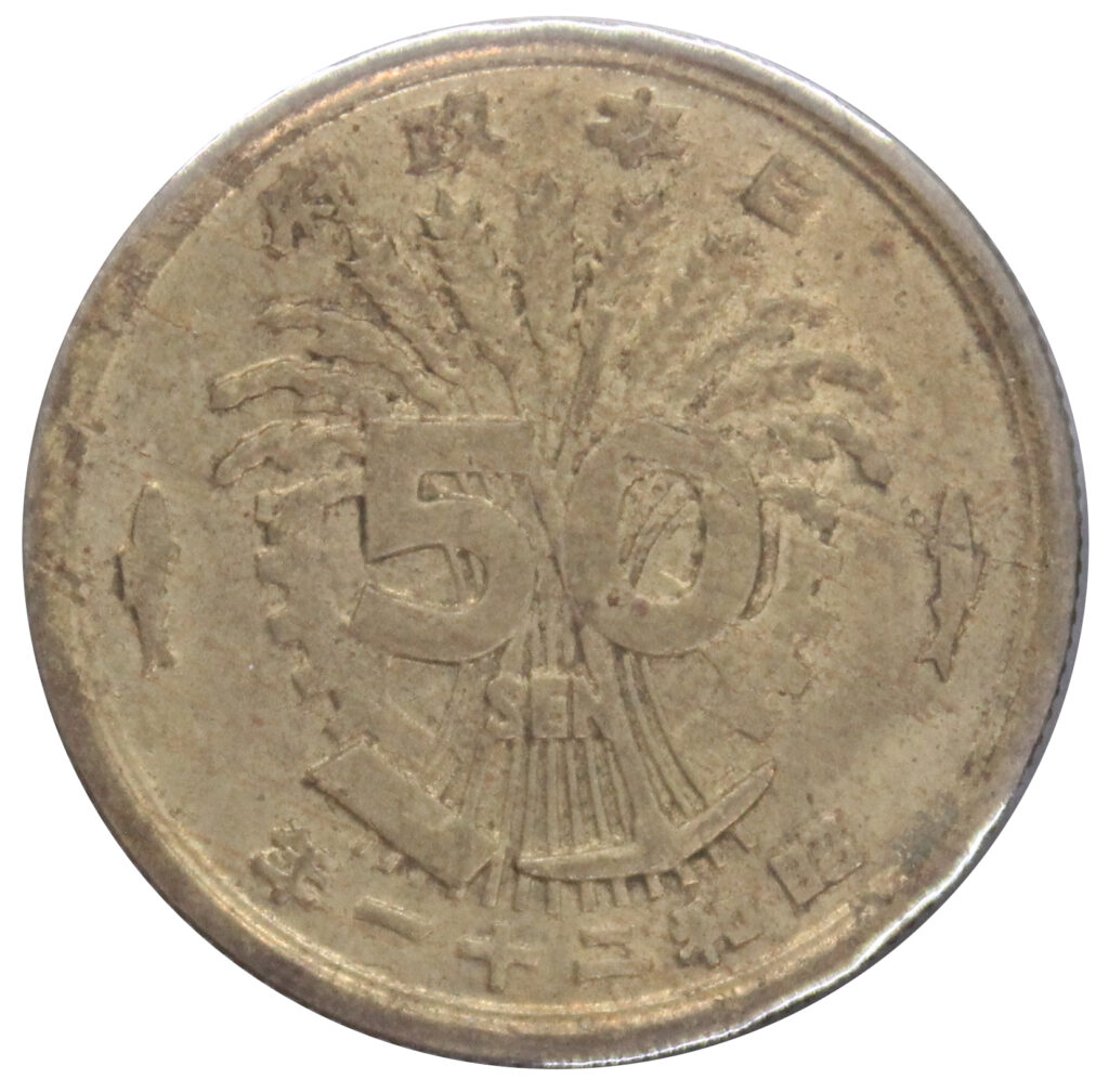 The large 50-sen brass coin is a temporary auxiliary currency made of brass with a diameter of 23.5 mm, issued between 1946 (Showa 21) and 1947 (Showa 22). Produced against the backdrop of postwar shortages, it is characterized by a design featuring a phoenix. Coins dated 1947 (Showa 22) are considered rare and may command very high prices on the market.