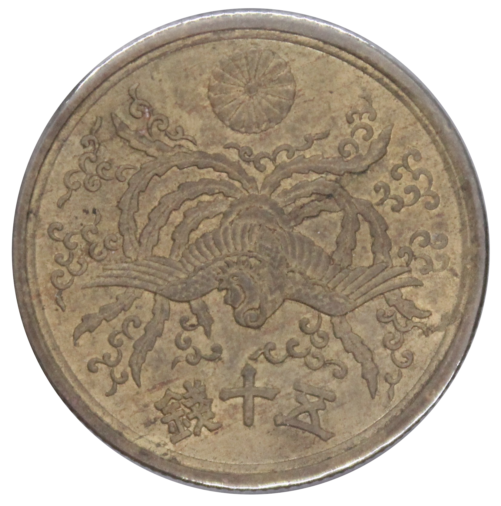 There is a variant of this coin in which a line appears between the phoenix’s head on the obverse and the characters “50 sen.”For more details, please refer to the webpage linked below.