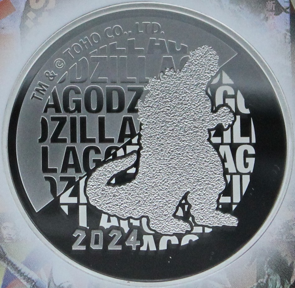 The obverse of the silver medal features a design of Godzilla (1995). The reverse features a silhouette of Godzilla (1954).