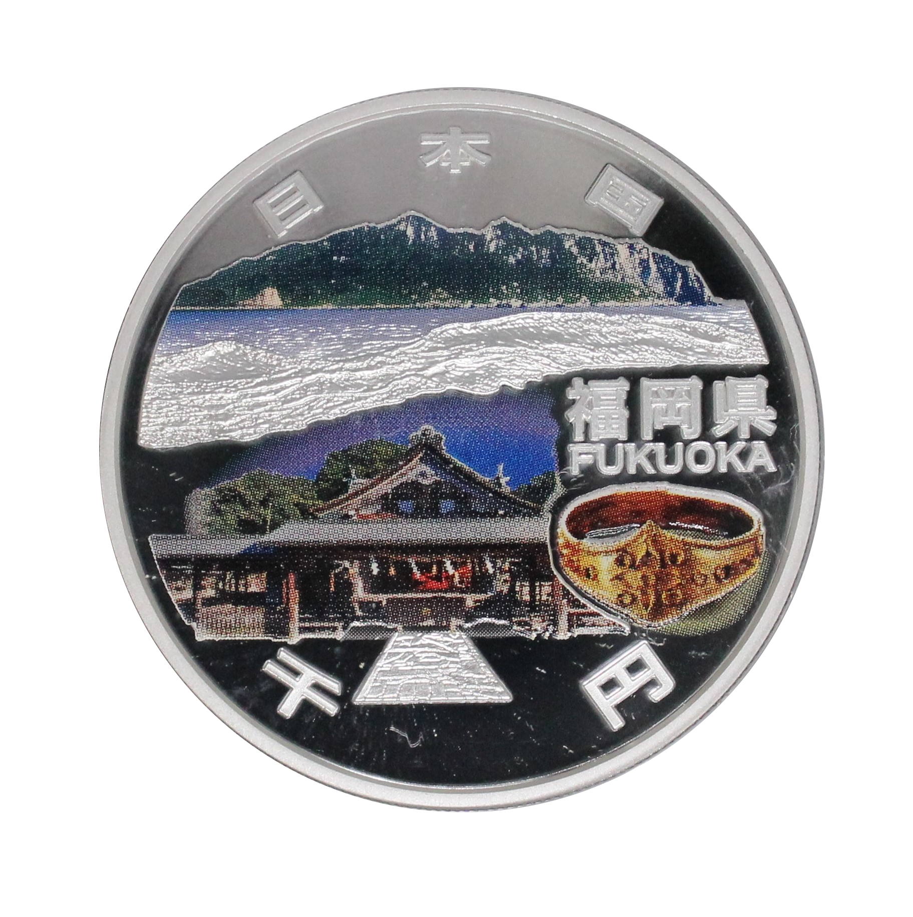 The Fukuoka Prefecture coin depicts Okinoshima, Munakata Taisha Shrine, and the national treasure, the gold ring.
