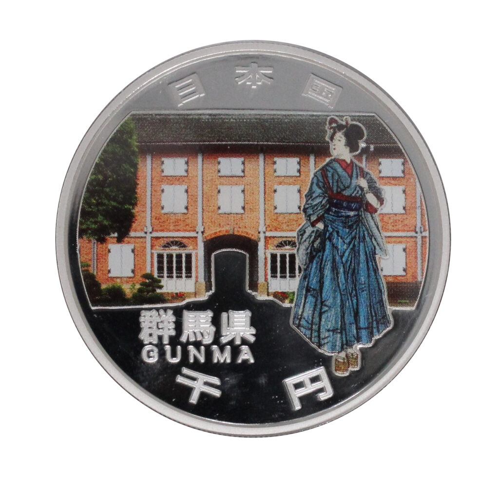 The Gunma Prefecture coin depicts the Tomioka Silk Mill, the East Cocoon Warehouse, and silk-reeling women.