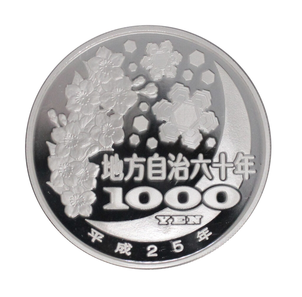 These silver coins were issued to commemorate the enforcement of Japan’s Local Autonomy Law.