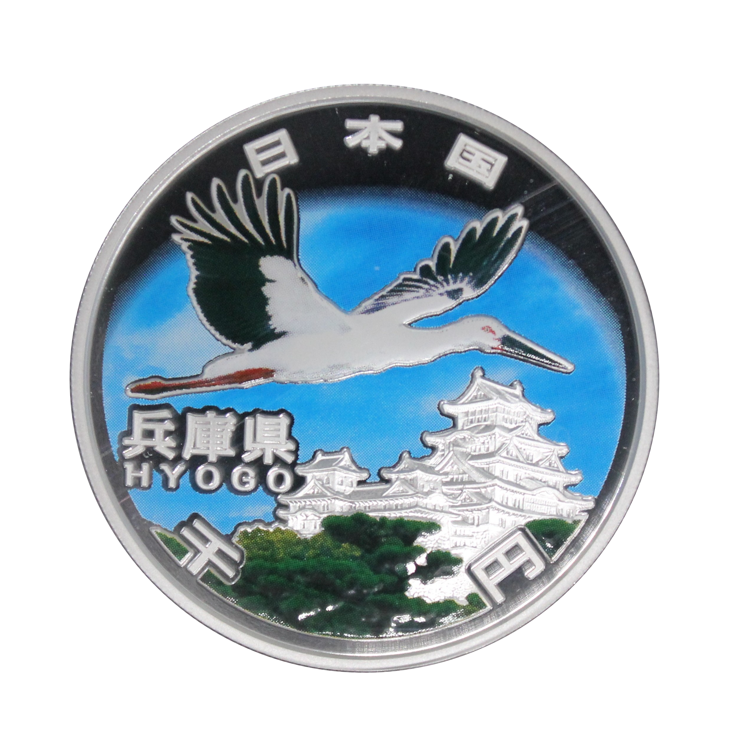 Hyogo Prefecture coins feature the stork, a Special Natural Monument, and Himeji Castle, a National Treasure.