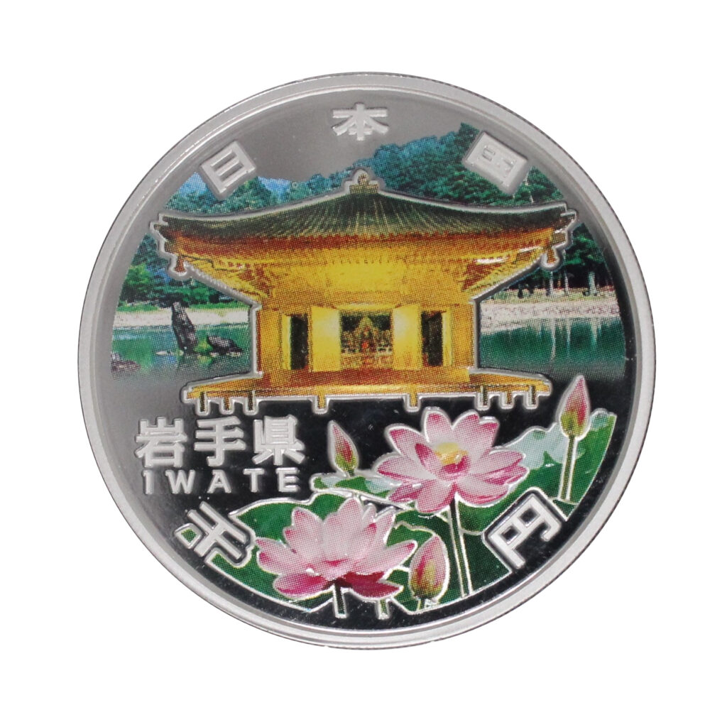The coins of Iwate Prefecture feature designs of the National Treasure Konjikido Golden Hall and Chusonji Temple lotus, along with the Pure Land Garden of Mōtsūji Temple.