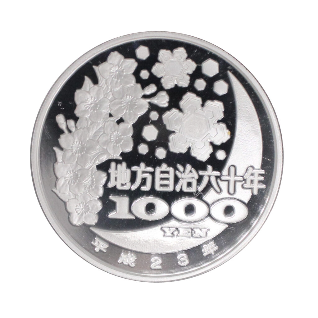 These silver coins were issued to commemorate the enforcement of Japan’s Local Autonomy Law.