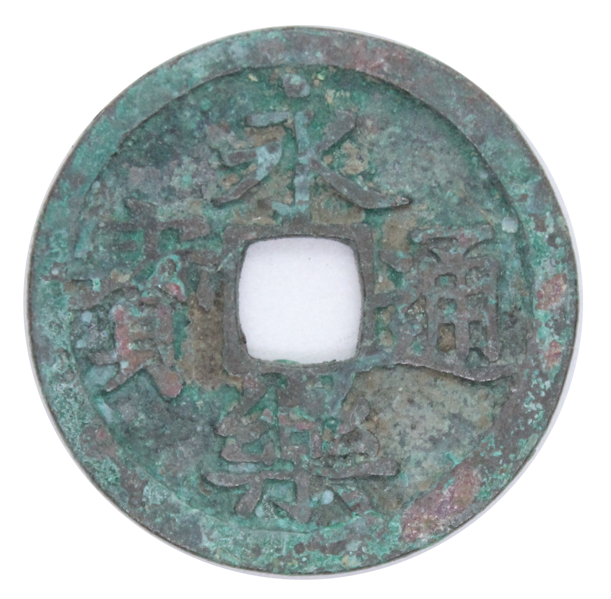 A “Keichō-tsūhō” coin valued at 1 mon, Tokugawa shogunate of Japan, 1606; Mito mint, Hitachi Province. Size: 22mm; weight: 2.53g. Reference: Hartill 3.40. Cherrygarden collection, ex Stephen Album Rare Coins (Auction 39, Lot 3399).