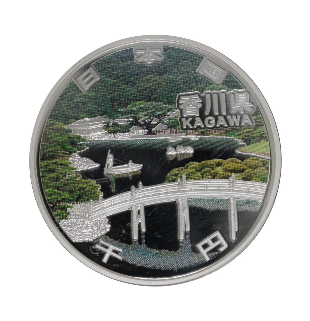 The Kagawa Prefecture coin depicts the view from Hiraihou Peak in Ritsurin Park.