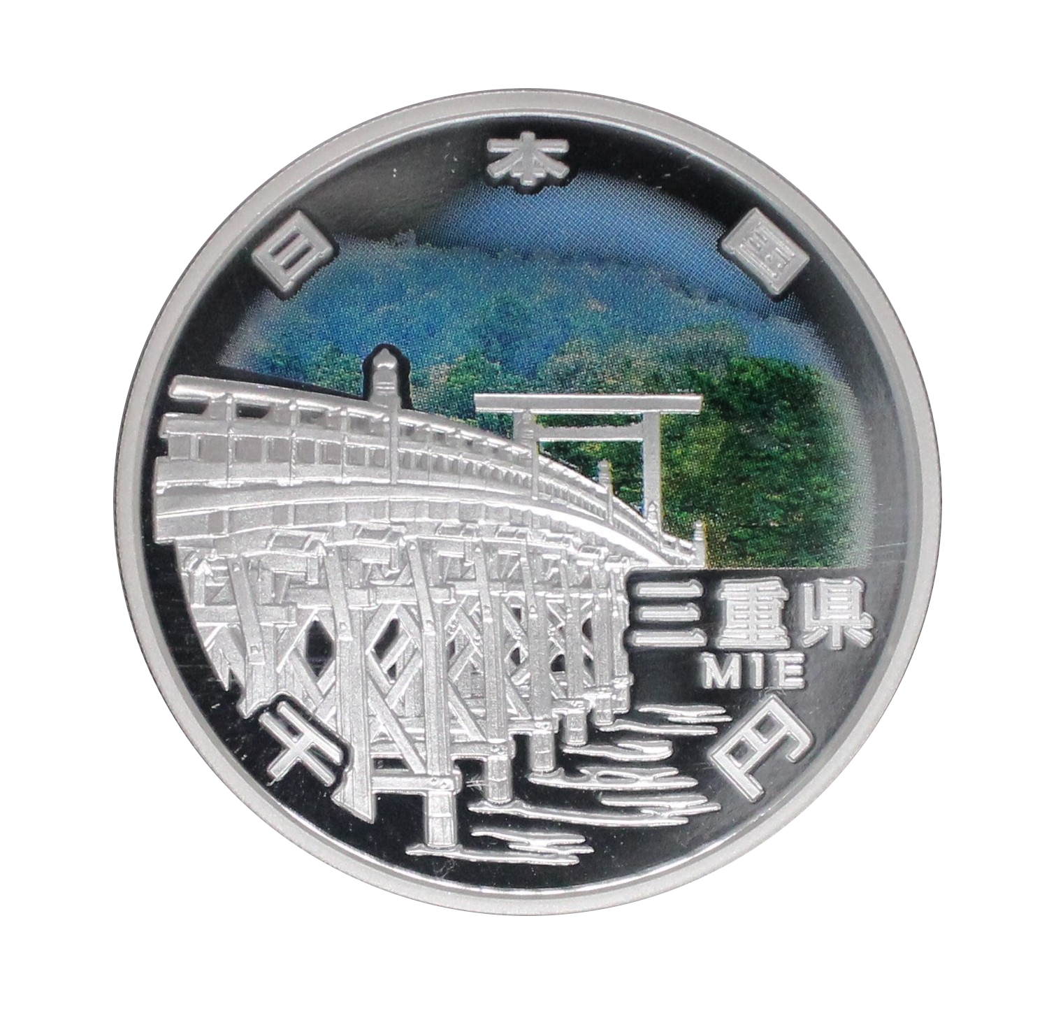 The coins of Mie Prefecture feature the Isuzu River and the Uji Bridge of Ise Grand Shrine.