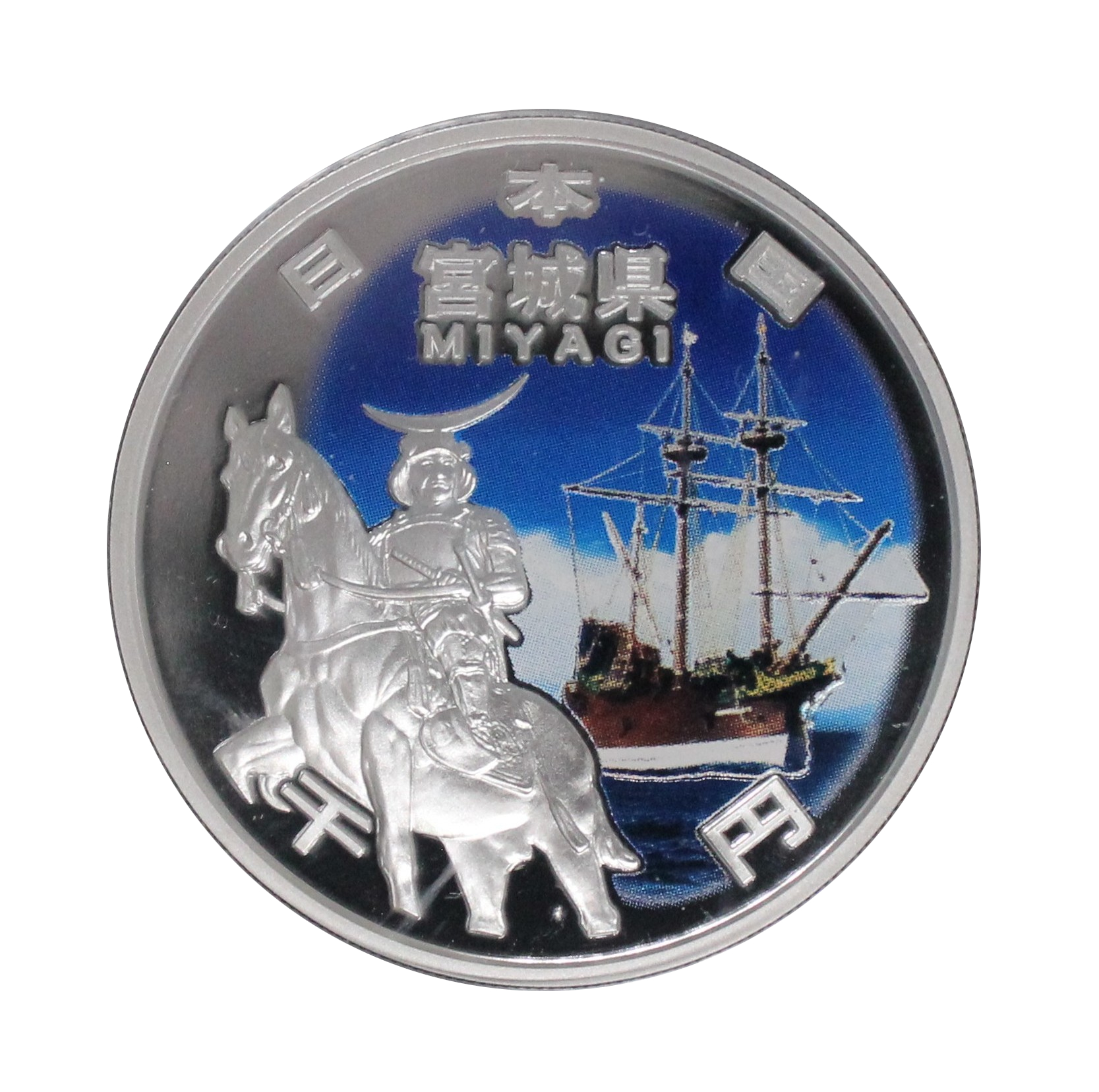 The Miyagi Prefecture coin depicts Date Masamune and the Keicho Embassy ships.
