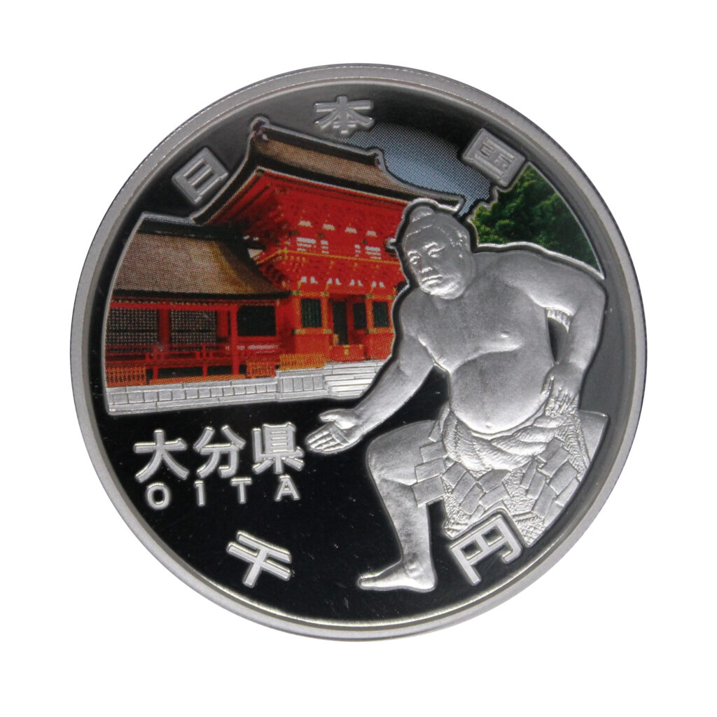 The Oita Prefecture coin depicts the Minami-Churomon Gate of Usa Jingu Shrine and Yokozuna Futabayama, a native of Oita Prefecture.