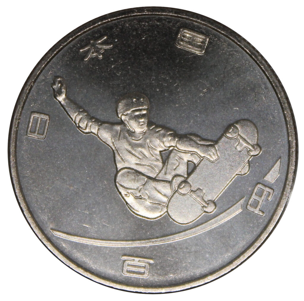 This coin depicts Skateboarding, one of the Olympic sports.