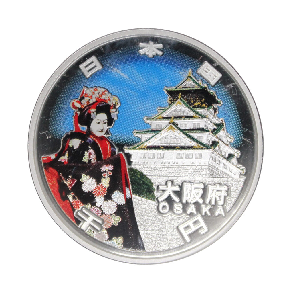 The Osaka Prefecture coin depicts Osaka Castle and Bunraku.